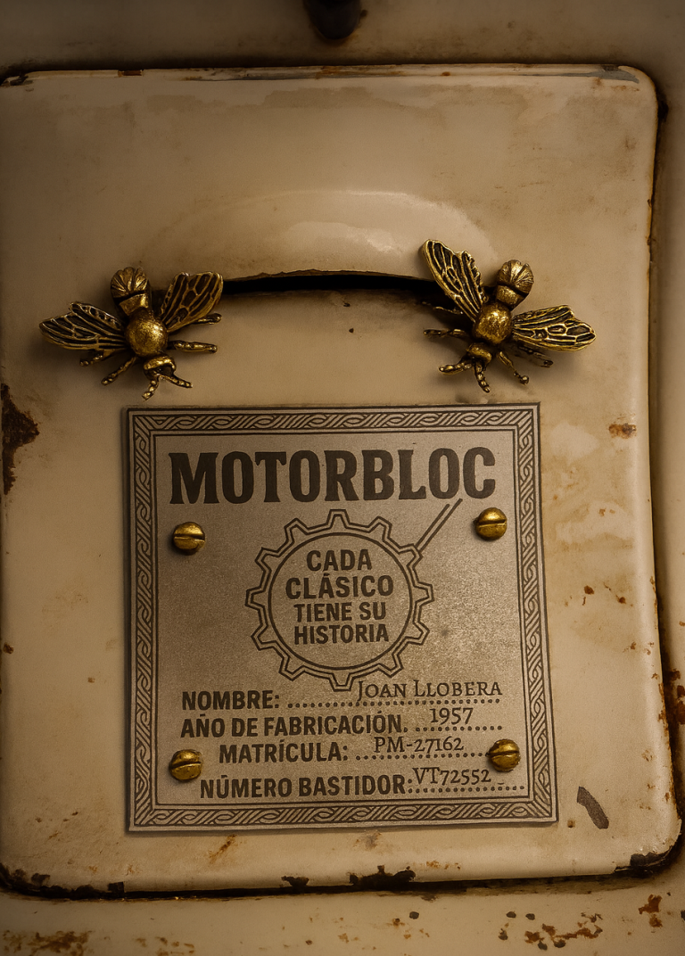 Placa identificativa en acero inoxidable diseñada especialmente para modelos de Vespa de los años 50. Fabricada con acabado de alta calidad y grabado preciso, permite añadir nombre, año de fabricación, matrícula y número de bastidor para conservar la historia de cada clásico.