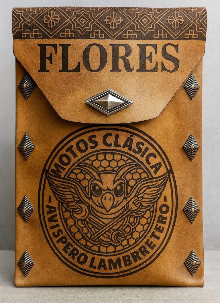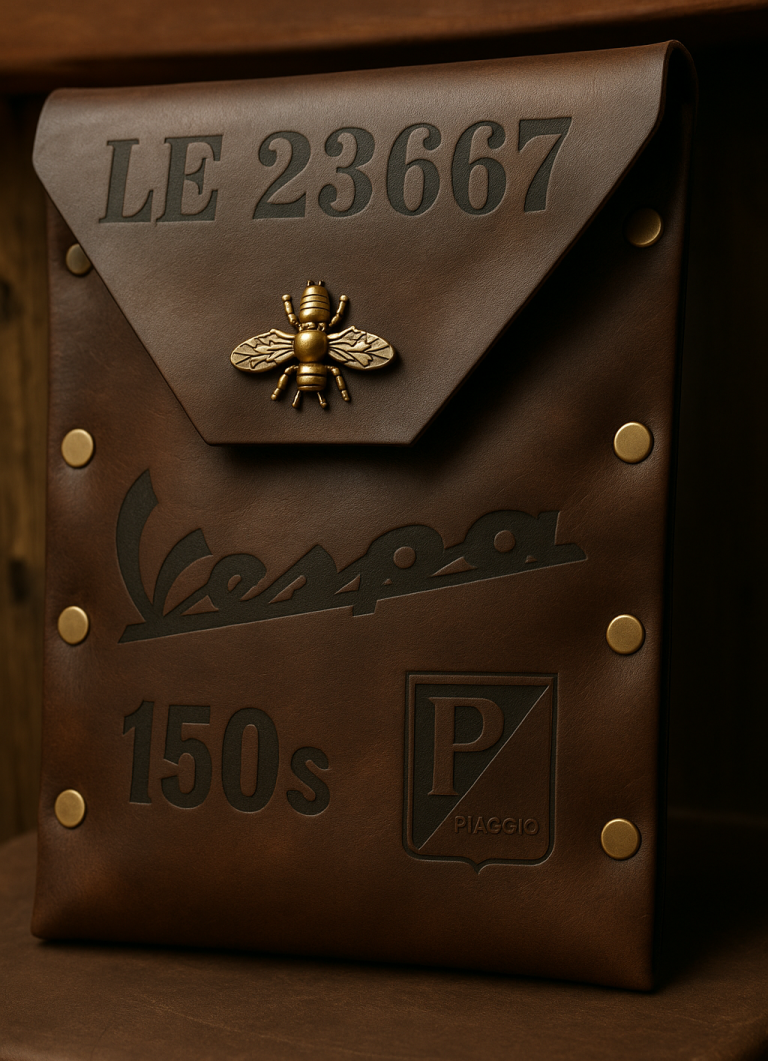 Fabricada artesanalmente en piel de alta calidad, diseñada para resistir el uso diario y envejecer con carácter. Cada pieza se personaliza bajo pedido, creando un accesorio único para tu scooter clásico o para uso personal.
