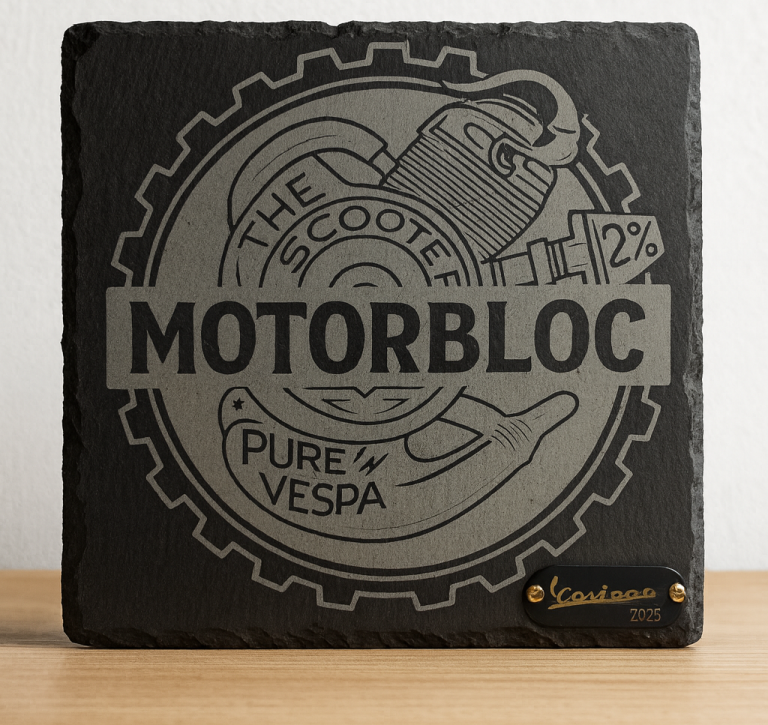 Emblema fabricado en acero inoxidable de alta calidad, resistente a la corrosión y pensado para mantener un acabado impecable durante años. Cada pieza es personalizable mediante grabado, permitiendo añadir nombres, números, logos o cualquier detalle que haga única tu Vespa.
