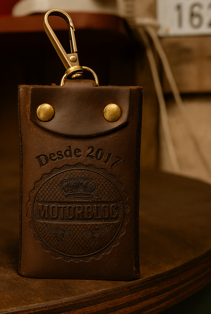 Este porta-llaves está fabricado en piel de alta calidad, grabado a láser con el diseño exclusivo MotorBloc y montado a mano en nuestro taller. Su interior incorpora un sistema metálico para hasta 6 llaves, manteniéndolas ordenadas, silenciosas y protegidas.